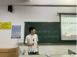 学习会议在庄严的国歌中拉开序幕,随后陈卓、廖伟杰、王远一、封礼荣、郭俊含、傅青达六位同学依次就十九届五中全会部分内涵做了深入的解读。充分让大家认识和了解党的十九届五中全会中全面建成小康社会,国家发展环境深刻而复杂的变化及“十四五”规划工作要求中关于深化改革构建高水平社会主义经济体制、乡村振兴、国防和军队的现代化建设、创新和现代产业体系发展四个大方面的深刻内涵。