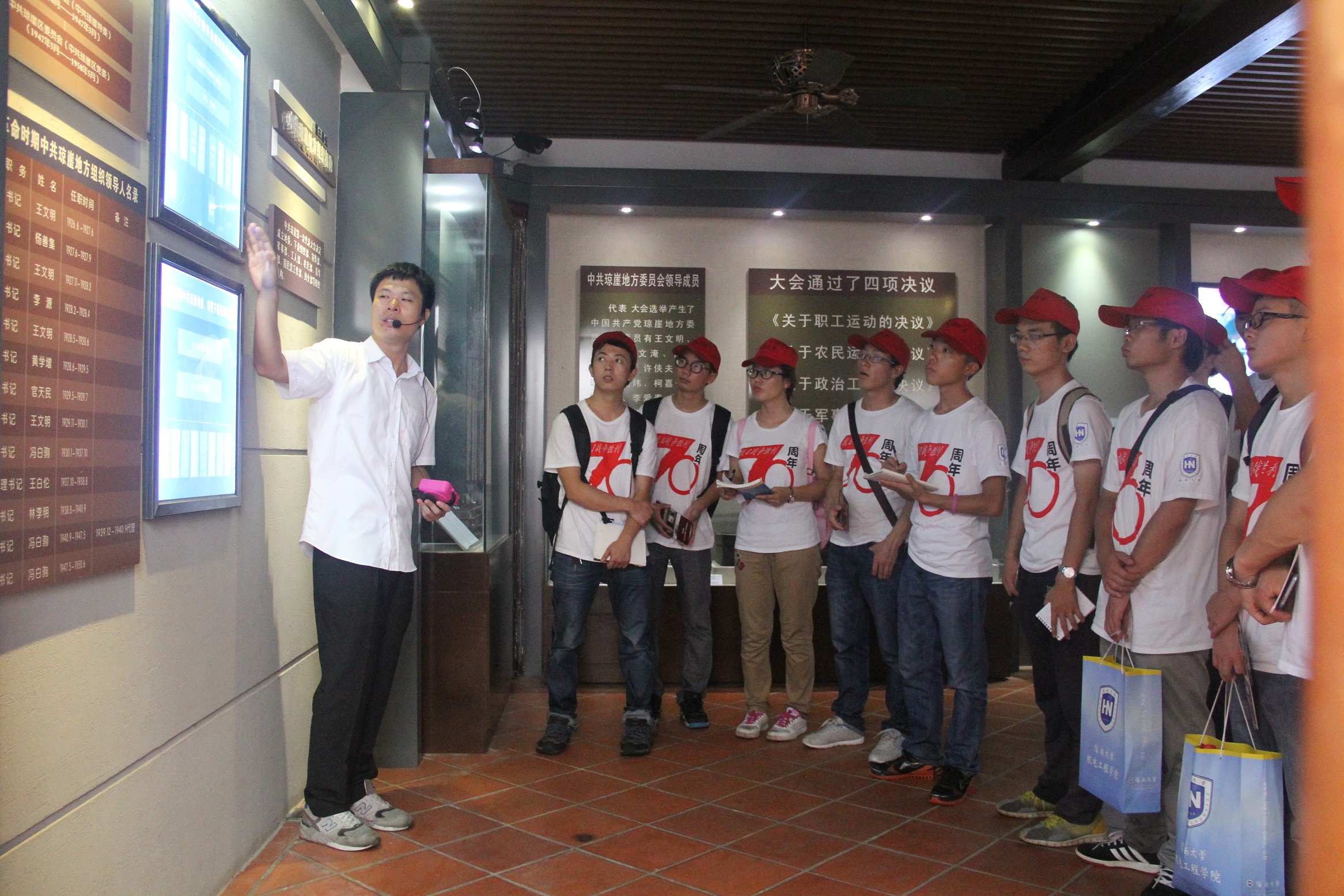 位于古韵犹存而又充满现代活力的骑楼老街中心,中共琼崖一大旧址邱家宅院安静的坐落在那里,像一个饱经风霜的老人,在自豪的欣赏着他子子孙孙的生活。进入邱家宅院,雕梁画柱,四合院设计,典型的琼北传统民居。中共琼崖一大正是在这里召开。在这里,选举产生了中国共产党琼崖地方委员会,揭开了琼崖人民革命斗争崭新的一页,确立了海南这一片区革命的核心,海南革命从此有了精神的指导。正是在这样一个地方,孕育了红色革命不屈的精神,为“二十三年红旗不倒”的奇迹建立了不可动摇的根基。中共琼崖一大旧址于2001年被国务院公布为全国重点文物保护单位,是海南省开展保持共产党员先进性教育、爱国主义教育和青少年思想道德教育的重要场所。寻访团跟随着讲解员的脚步,一一参观了中共琼崖一大旧址内的史料展,聆听了海南琼崖地区的革命抗战历史。随后,寻访团还在中共琼崖一大旧址内的投影室观看“琼崖曙光”,在场员工对海南琼崖革命抗战史有了更进一步的认识。