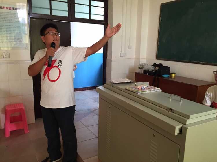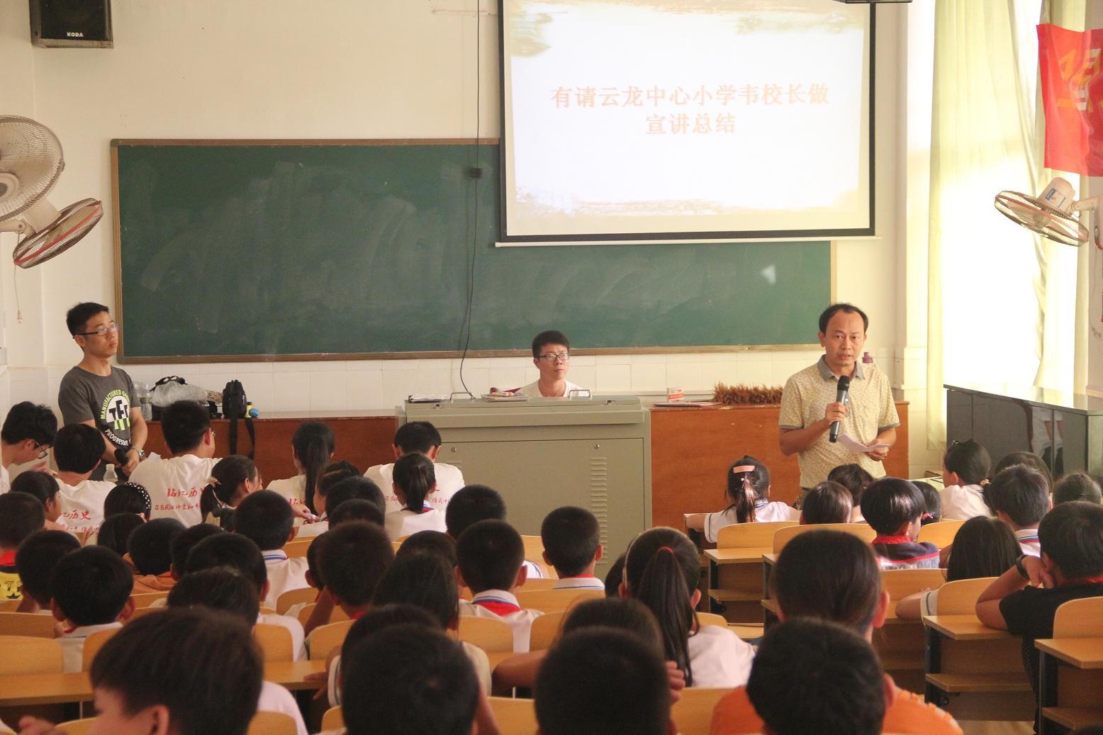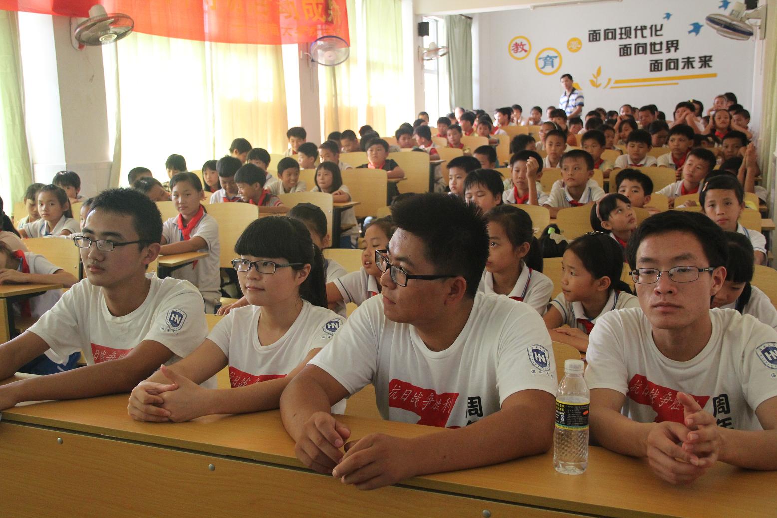 下午两点三十分,团队成员准时到达云龙中心小学,在该校韦副董事长的帮助下,参加活动的100多位同学有序地进入会场就坐后,活动顺利开始。活动开始前,团队成员为同学们播放了前期制作的视频《全国老员工纪念抗战胜利70周年寻访活动》,视频具体围绕抗战胜利七十周年展开,逐步将主题引入抗战时期的海南战场,进而引出本次宣讲活动的主题——“铭记历史、圆梦中华”,视频结束后,团队代表团队代表朱凯峰、起家林等六名同学分别就本次暑期社会实践活动中印象最深的一位抗战老兵的故事与同学们一起交流,团队成员以生动的言语,将张云逸大将、远征军云昌舜等人的抗战光荣事迹讲给同学们听,使同学们对抗战有了更加深刻的记忆与体会。