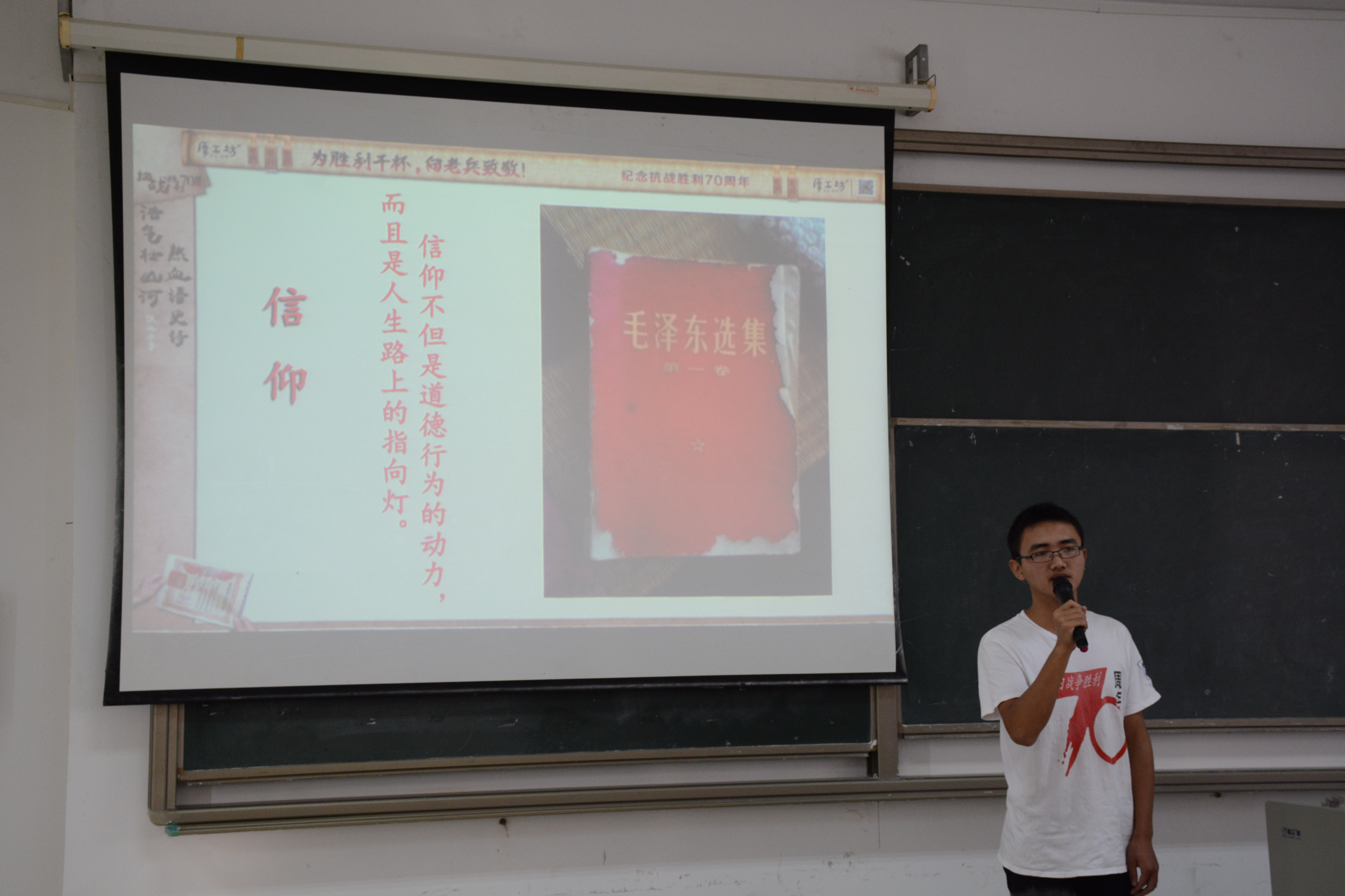 12月13日上午,在3号教学楼212课室,bevictor1946韦德官网“致远传承”寻访团为第十一期党课积极分子带来了一场别开生面的党课——分享了团队暑期纪念抗日战争胜利70周年寻访活动经历、体验和收获。出席活动的有辅导员崔建兵、崔万春老师,分享成员有起家林、朱凯峰、李贺、杨建平、李庆庆等五名同学。会议由机械系第一员工党支部宣传委员金杯主持。