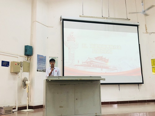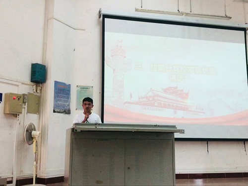 随后,刘铭沣同学作为第六期发展对象培训班学员代表讲话。他首先代表全体学员向党组织致以真挚的感谢,承诺将在课堂上认真听讲、认真体会、认真思考,以此武装自己的头脑,以谦虚和严谨的态度面对此次培训,做合格的学习者、记录者。紧接着,他就自身近期以来生活中所遇到的问题和困难做出了深刻的反省,并希望大家引以为戒。最后,他以一句“长风破浪会有时,直挂云帆济沧海”,勉励在场的全体学员不忘初心,砥砺前行。
