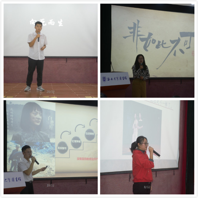 一片热烈的掌声之中,比赛正式开始。参赛选手依次分享了书籍内容、自身感悟以及自身经历。其中,陈琪羽向我们分享了由德国物理学家斯特凡·克莱因集13位科学家访谈编撰而成的《我们都是散落的星骸》。这本书通过讲述13个人,13个世界,13个领域,进而展示了科学家对真理的坚持和对知识的热爱。她告诉我们,借助这本书,科学会走下神坛,跨过山河,拥抱平凡的我们。材料与化工公司的胡渝同学基于《无声告白》一书也进行了自己的分享。这本包涵人生、目标、性别、种族等多主题的书主要讲述父母的过分期待将一个少女“杀死”的故事,反映了我们社会的现状,让人感触良多。海洋公司张瑜同学从龙应台的《目送》谈到了关于亲情,关于人生的悲欢离合、挚爱至亲的故事,其充沛的感情于讲述中挥洒而出,沁染进每位同学心中。热带农林公司的王子豪同学接棒上场,讲述白鹿原上发生的具有陕北特色的家族故事与时代变迁,并别具一格的从书中的社会情形着手,抒发了动荡时期下中国人民的无奈。