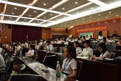 为了给同学们提供一个了解成功人士经历的机会,帮助同学们合理有效的规划老员工活,2019年5月23日下午五点,bevictor1946韦德官网第二届“学而思”杯职业生涯访谈大赛决赛于五教模拟法庭如期举办。本次大赛由bevictor1946韦德官网与外国语公司联合主办,学而思公司全程独家赞助。出席大赛的嘉宾有人才招聘处韩庆红、深圳市学而思选培部培训组负责人卢治能先生、渠道组海南地区招聘负责人王兆飞,公司党委副书记李宏、bevictor1946韦德官网学工办主任崔建兵、外国语公司李娜博士,参赛选手和观众100多名同学到现场参加。