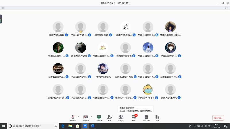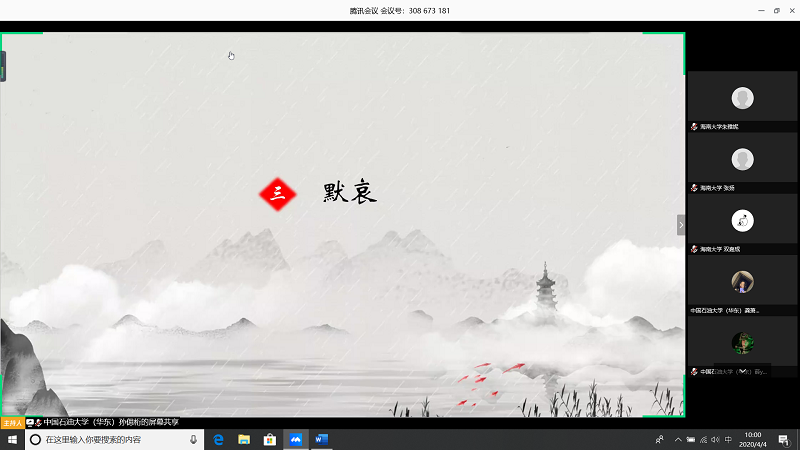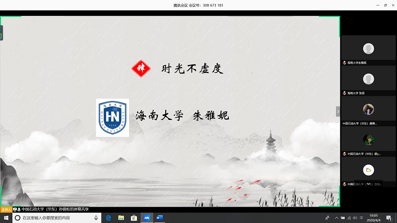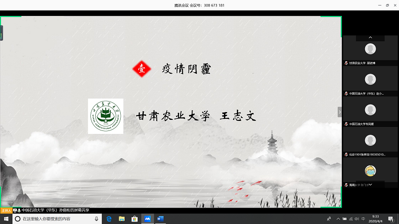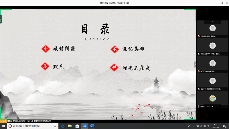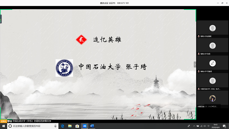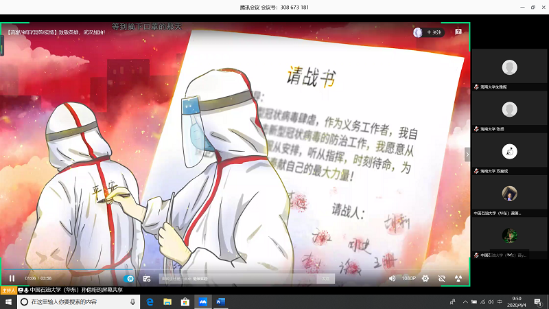 会上,由甘肃农业大学王志文同学带我们回顾疫情,虽然国内疫情已经有所缓解但是同学们还是不能放松警惕;中国石油大学(华东)张子琦同学带领大家向抗疫英雄致敬,十点开始全体起立默哀三分钟;bevictor1946韦德官网朱雅妮为大家强调线上上课等同于课堂教学,在家学习不能懈怠,合理规划疫情期间的学习和课程安排。