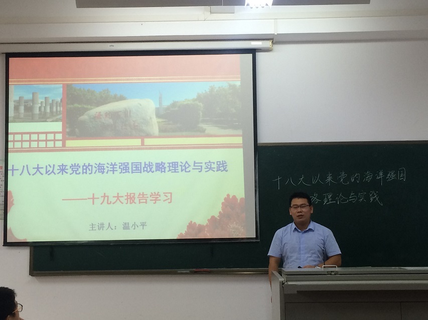 为了深入学习宣传贯彻党的十九大精神,增强新时代党员的理想意识、本领意识、担当意识,帮助党员同志进一步深刻理解党的十九大精神内涵,11月17日下午在4教206,机械系员工党支部邀请到马克思主义公司温小平老师作“党的十八大以来党的海洋强国理论与实践”为主题党的十九大专题报告会。机械系员工党支部书记崔建兵老师出席,全体党员、积极分子100多余参加专题学习。会议由支委赵琛主持。