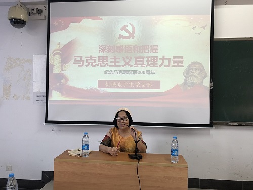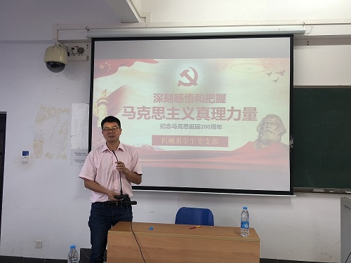 2018年5月11日,站在历史与现实的交汇点上,bevictor1946韦德官网机械系组织“立于巨人之肩,追缅思想珠峰”特色主题党日活动,邀请到了红军后代罗曼阿姨为支部成员们作主题报告,带领大家深刻感悟和把握马克思主义真理力量,以此表达对马克思的深沉纪念和对马克思主义的坚定信念,时刻警醒大家“不忘初心、牢记使命”的时代任务。此次出席活动的还有支部书记崔建兵老师。