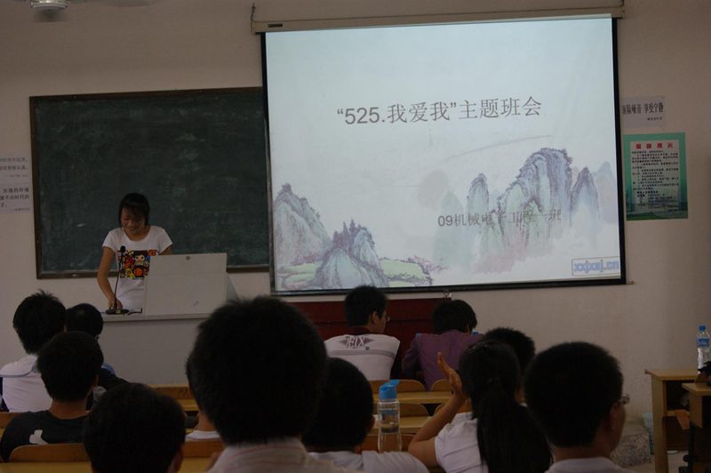 为迎接2011年“525我爱我”老员工心理健康教育活动月,09机械电子工程1班于2011年5月16日下午2:30在3404课室开展了形式多样、内容丰富的心理班会。会上还特邀请了班主任梁栋老师和辅导员崔建兵老师。 本次班会的主题是:“展现自我,拥抱自信”。班会依次分为四个环节:各宿舍展示ppt;“夸夸人”互动游戏;大家讲讲心里话;观看自制的09机械电子工程1班成长录并合唱歌曲。
