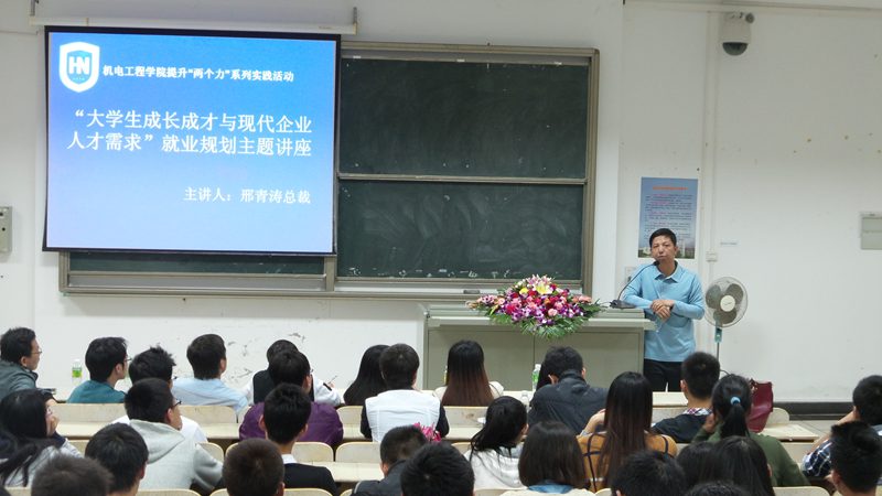 会议伊始,黄国标副书记与在场师生一道表达了对邢总一行人此次到来的热烈欢迎并介绍了邢总的基本情况。在讲座中,邢总从他自身经历谈起,从适应老员工活、实现角色转换,到就业创业、留学考研,他以亲切幽默的口吻以及真挚的情感拉近了与员工的距离,讲述了一个又一个催人奋进的故事。