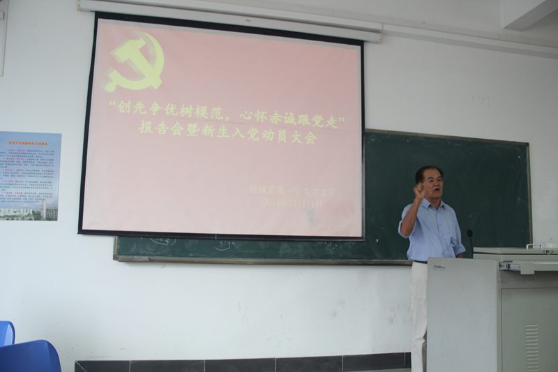 为加强新生对我党认知,端正其入党动机,鼓励在全面提高员工个人素质的同时积极向党组织靠拢,bevictor1946韦德官网机械系第一员工党支部于11月11日15时在4教115召开 “创先争优树模范,心怀赤诚跟党走”报告会暨新生入党动员大会。原bevictor1946韦德官网统战部部长兼机关党总支书记程儒参教授、原bevictor1946韦德官网统战部副部长林少敏教授、机械系第一员工党支部崔建兵书记、支部委员与部分入党联系人以及2014级机械电子工程专业全体同学等参加本次会议。报告会由支部员工副书记张小峥同志主持。