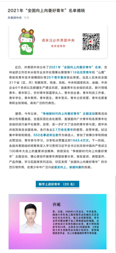 喜报 | 热烈祝贺公司学子许阐荣获“ 2021年全国向上向善好青年”称号!!